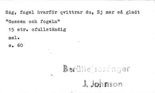 //// Säg, fogel hvarför qvittrar du, Ej mer så gladt //// "Gossen och fogeln" //// 15 str. ofullständig //// mel* //// s. 60