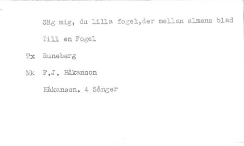 //// Säg mig, du lilla fogel,der mellan almens blad Till en Fogel Tx Runeberg Mk F.J. Eåkanson //// Håkanson. 4 Sånger