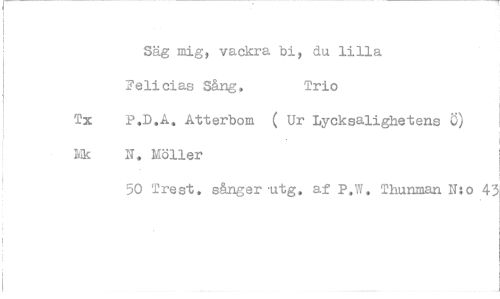 //// Säg mig, vackra bi, du lilla Felicias Sång, Trio //// P.D.A, Atterbom ( Ur Lycksalighetens 3) N. Möller //// 50 Trest. sånger utg, af P,W. Thunman N:o
