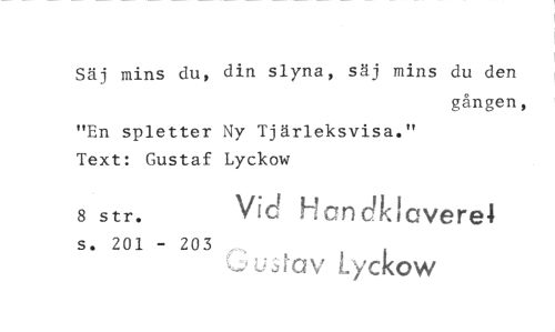 //// Säj mins du, din slyna, säj mins du den //// gången, //// "Bn spletter Ny Tjärleksvisa." //// Text: Gustaf Lyckow //// s str. Vid Hcncfkicverel //// s. 201 - 203 //// ^Ujiav Lyckow