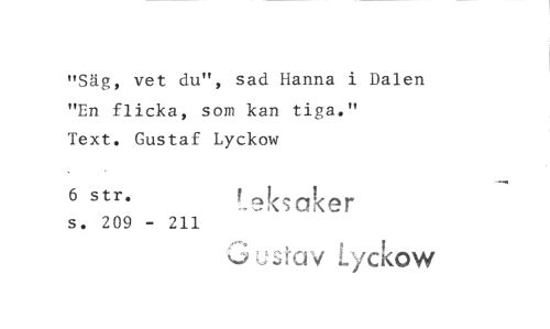 //// "Säg, vet du", sad Hanna i Dalen "En flicka, som kan tiga." //// Text. Gustaf Lyckow //// ^ str* Leksaker //// s. 209 - 211