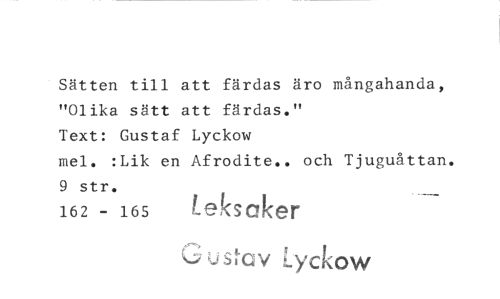 //// Sätten till att färdas äro mångahanda, "Olika sätt att färdas." //// Text: Gustaf Lyckow //// mel. :Lik en Afrodite., och Tjuguåttan. 9 str. //// 162 - 165