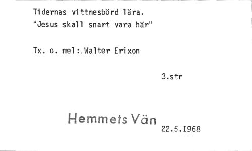 //// Tidernas vittnesbörd lära. //// "Jesus skall snart vara här" //// Tx. o. mel:,Malter Erixon //// 3.str //// Hemmefs Vän //// 22.5.1968
