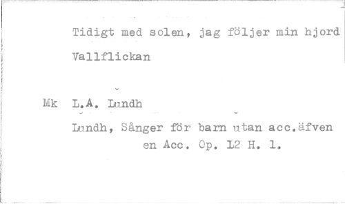//// Tidigt med solen, jag följer min hjord Vallflickan //// L.A. Lundh //// Lundh, Sånger för bam utan a c c. äf ven en Acc. Op. 12 H. 1.