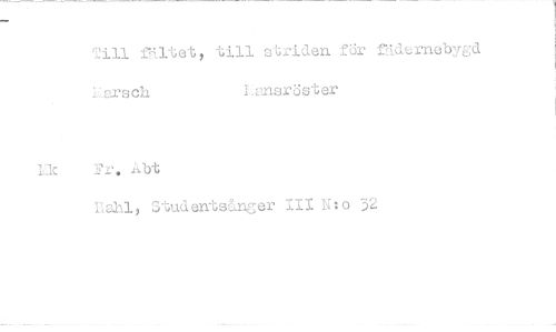 //// Till fältet, till striden for fädernebygd //// 1 srsch //// Lic Fr. Abt //// I.ansröster //// Rshl, Studentsånger 111 N:o 32