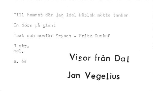 //// Till hemmet där jag idel kärlek mötte tanken En darr på glänt //// Text och musik: Fryman - Fritz Gustaf //// 3 str. mel. //// Visor från Da t //// S . o o //// Jan Vegetius