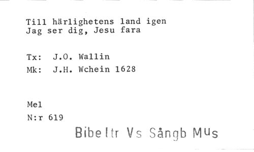 //// Till härlighetens land igen Jag ser dig, Jesu fara //// Tx: J.O. Wallin Mk: J.H. Wchein 1628 //// Mel //// N:r 619 //// Bibe !tr Vs Sångb MUs