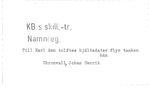 //// ! KB.ssML-tr. //// i //// Namnreg. //// Till Karl den tolftes hjältedater flyr tanken s hän //// Chronvall^ Johan Henrik