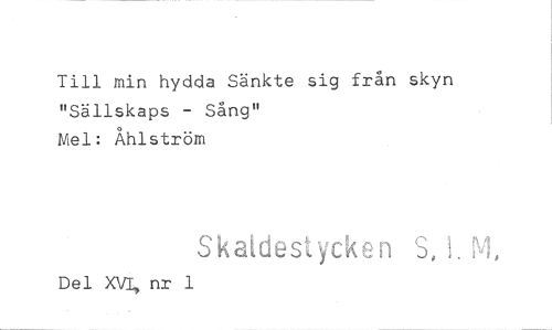//// Till min hydda Sänkte sig från skyn "Sällskaps - Sång" //// Mel: Åhlström //// Skaidestycken S,M, //// Del XVI, nr 1