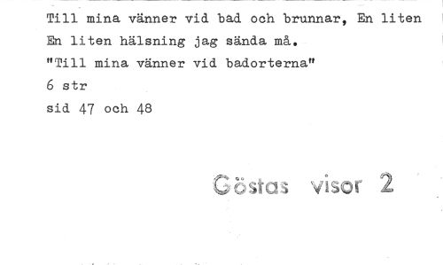 //// Till mina vänner vid bad och brunnar, En liten En liten hälsning jag sända må. //// "Till mina vänner vid badorterna" //// 6 str //// sid 47 och 48