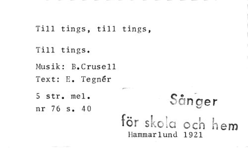 //// Till tings, till tings, //// Till tings. //// Musik: B.Crusell Text: E. Tegnér //// 5 str. mel. nr 76 s. 4 0 //// för skc!a //// Hammarlund //// anger //// ocn n //// 1921