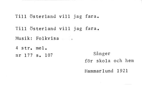 //// Till österland vill jag fara. //// Till Österland vill jag fara. //// Musik: Folkvisa 4 str. mel. //// nr 177 s. 107 Sånger //// för skola och hem //// Hammarlund 1921