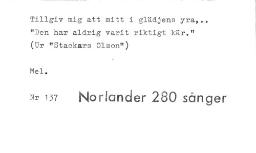 //// Tillgiv mig att mitt i glädjens yra,.. "Den har aldrig varit riktigt kär." //// (Ur "Stackars Olson") //// Mel. //// Nr 137 Norbnder 280 sånger