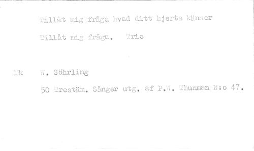 //// tillåt nig fråga, hvad ditt hjerta känner Jillåt riig fråga. Trio //// Söhrling //// 50 Jrestäm. Sånger utg. af P.3. ihunman N:o 4