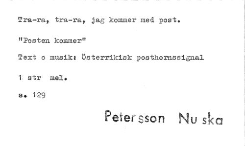 //// Tra-ra, tra-ra, jag kommer med post. //// "Posten kommer" //// Text o musik: Österrikisk posthomssignal //// 1 str mel. s. 129 //// Petersson Nu sk