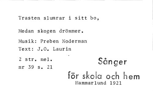 //// Trasten slumrar i sitt bo, //// Medan skogen drömmer. //// Musik: Preben Noderman Text: J.O. Laurin //// 2 str. mel. nr 39 s. 21 //// för skcia och h //// Hammarlund 1921