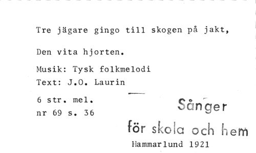 //// Tre jägare gingo till skogen på jakt, //// Den vita hjorten. //// Musik: Tysk folkmelodi Text: J.O. Laurin //// 6 str. mel. ^ //// oanper //// nr 69 s. 36 //// för skola och heRn //// Hammarlund 1921