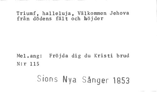 //// Triumf, halleluja, Välkommen Jehova från dödens fält och höjder //// Mel.ang: Fröjda dig du Kristi brud N:r 115 //// Sions Nya Sånger 1853