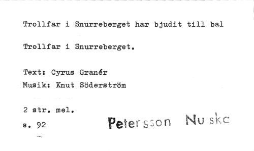 //// Trollfar i Snurreberget har bjudit till bal Trollfar i Snurreberget. //// Text: Cyrus Granér Musik: Knut Söderström //// 2 str. mel. //// s. 92