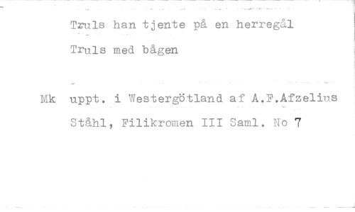 //// Truls hantjente på en herregål Truls med bågen //// uppt. i Westergötland af A.F.Afzelius Ståhl, Filikromen 111 Sami. No 7