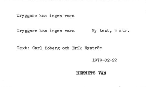//// Tryggare kan ingen vara //// Tryggare kan ingen vara Ny text, 5 str. //// Text: Carl Boberg och Erik Nystrom //// 1979-02-22 HEMMETS VÄN