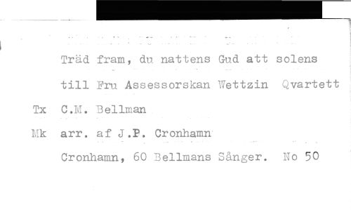 //// Träd fram, du nattens Gud att solens till Fru Assessorskan Wettzin Qvartett Tx C.M. Bellman Mk arr. af J.B. Cronhamn //// Cronhamn, 60 Bellmans Sånger. No 50