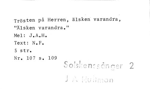 //// Trösten på Herren, älsken varandra, "Alsken varandra." //// Mel: J.A.H. //// Text: N.F. //// 5 str. //// Nr. 107 s. 109 //// ^ ^ //// 2 //// [ . -