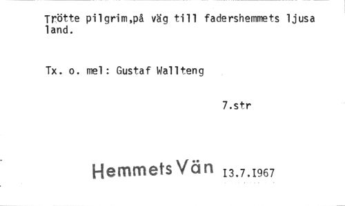 //// Trötte pilgrim,på väg till fadershemmets ljusa land. //// Tx. o. mel: Gustaf Wallteng //// 7.str //// 1967