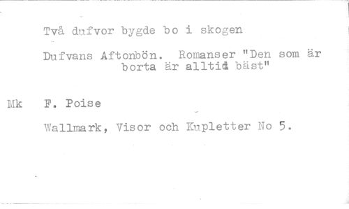 //// Två dufvor bygde bo i skogen //// Dufvans Aftonbön. Romanser "Den som är borta är allti& bäst" //// Mk F, Poise //// Wallmark, Visor och Kupletter No 5.
