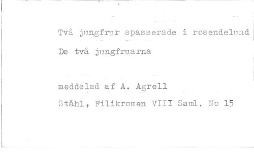 //// Två jungfrur spasserade. i rosendelund De två jungfruarna //// meddelad af A. Agrell //// Ståhl, Filikromen VIII Sami. No 15