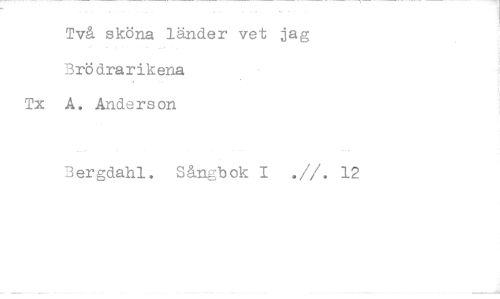 //// Två sköna länder vet jag Brödrarikena A. Anderson //// Bergdahl. Sångbok I .//.