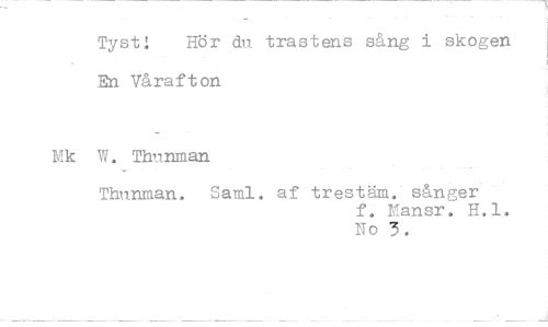 //// Tyst i Hör du trastens sång i skogen En Vårafton //// W, Thunman //// Thunman. Sami. af trestäm. sånger //// f. Nansr. H.l. No 3.