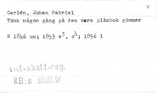 //// Carlén, Johan Gabriel //// Tänk någon gång på den vars plånbok gömmer //// E 18^6 uu; 1853 s3, c^; 1856 i //// KB;S skijLtr
