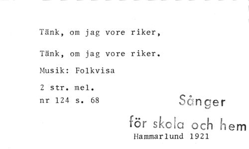 //// Tänk, om jag vore riker, //// Tänk, om jag vore riker. //// Musik: Folkvisa //// 2 str. mel. //// nr 124 s. 68 ger //// rör skcia och h //// Hammarlund 1921