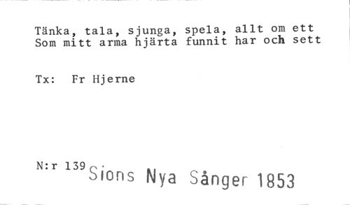 //// Tänka, tala, sjunga, spela, allt om ett Som mitt arma hjärta funnit har och sett //// Tx: Fr Hjerne //// N:r 139 Q. //// o tons Nya Sånger 1853