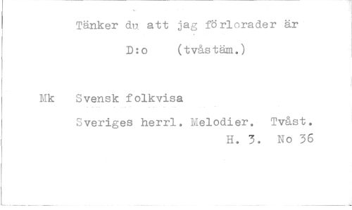 //// Tänker du att jag förlorader är D:o (tvåstäm.) //// Svensk folkvisa //// Sveriges herrl, Melodier. Tvåst. //// H. 3. No 36