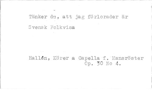 //// Tänker du, att jag förlorader är //// Svensk Folkvisa //// Hallén, Körer a Capella f. Mansröster //// Op. 30 No 4,
