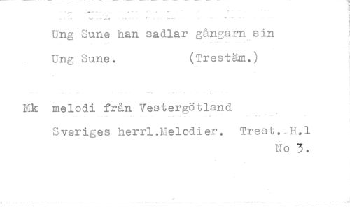 //// Ung Sune han sadlar gångam sin Ung Sune. (Trestäm.) //// Hk melodi från Vestergötland //// Sveriges herrl.Melodier. Trest.-H.l //// No 5.