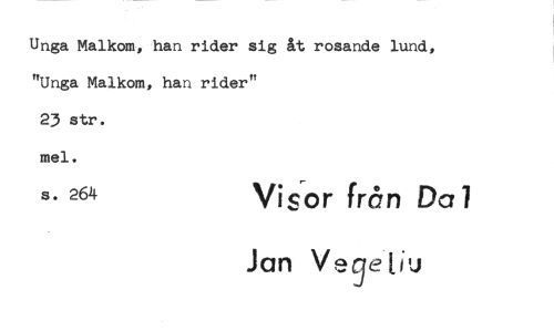 //// Unga Malkom, han rider sig åt rosande lund, "Unga Malkom, han rider" //// 23 str. mel. //// s- 264 Vigor från Dal //// Jan