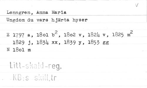 //// Lenngren, Anna Maria Ungdom du vars hjärta hyser //// E 1797 a, l8ol b^, l8o2 v, 182^ v, 1825 //// 1829 j, 183^ xx, 1839 y, 1853 gg //// N 180I m //// Litt-sRd j-reg, k!,.- - <<; ..tr