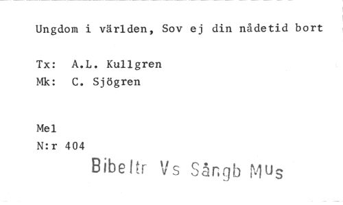 //// Ungdom i världen, Sov ej din nådetid bort //// Tx: A.L. Kullgren Mk: C. Sjögren //// Mel //// N:r 404 //// BibeHr Vs Sångb M^s