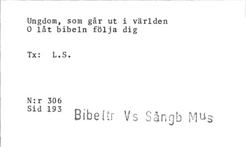 //// Ungdom, som går ut i världen //// 0 låt bibeln följa dig //// Tx: L.S. //// N: r Sid //// 306 //// 193 //// Bibeitr Vs //// v/ '-A //// ngb