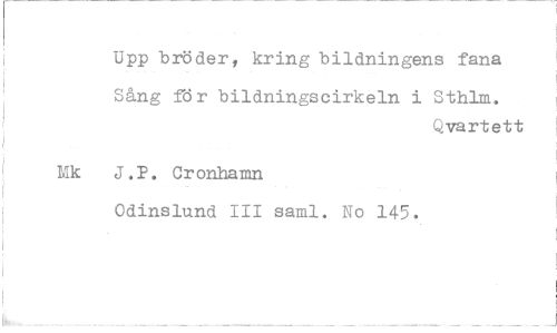 //// Upp bröder, kring bildningens fana //// Sång för bildningscirkeln i Sthlm. //// Qvartett //// J.P. Cronhamn //// Odinslund 111 saml. No 145.