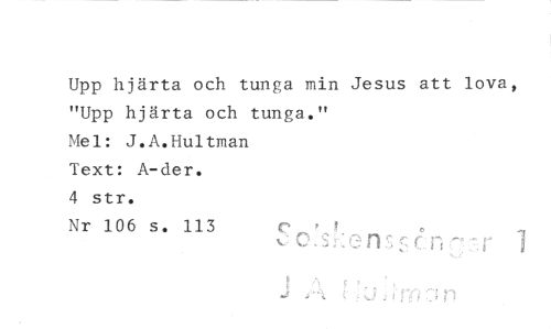 //// Upp hjärta och tunga min Jesus att lova, "Upp hjärta och tunga." //// Mel: J.A.Hultman Text: A-der. //// 4 str. //// Nr 106 s. 113