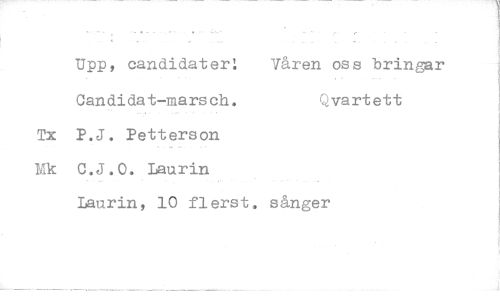 //// Upp, candidaterl Oan di da t-ma rs ch. //// Tx P.J. Petterson Hk C.J.O. Laurin //// Laurin, 10 flerst. //// Våren oss bringar Qvartett //// sånger