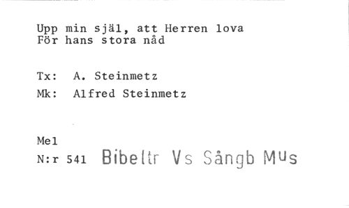 //// Upp min själ, att Herren lova För hans stora nåd //// Tx: A. Steinmetz Mk: Alfred Steinmetz //// Mel //// N:r 541 Bibettr Vs Sångb