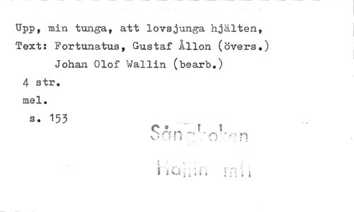 //// Upp, min tunga, att lovsjunga hjälten, Text: Fortunatus, Gustaf Ållon (övers.) Johan Olof Wallin (bearb.) //// 4 str. mel. //// s. 153 //// O" ! ! //// onn * o - ' n ^ ^ i ^ ^ 1 1 å i