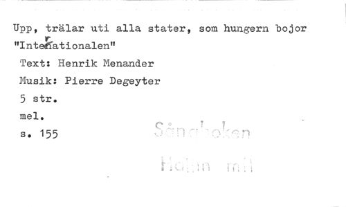 //// Upp, trälar uti alla stater, som hungern bojor r //// "Intedfationalen" //// Text: Henrik Menander Musik: Pierre Degeyter 5 str. mel. //// C ° ?! //// s. 155 ..*-1-