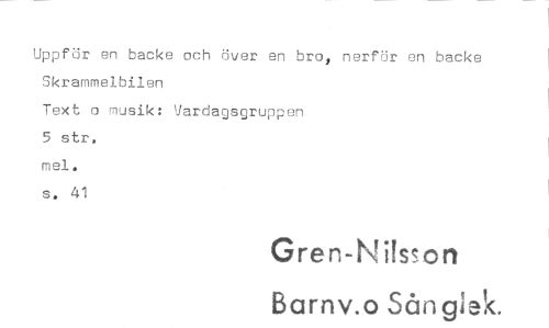 //// Uppfor en backe och over en bro, nerför en back Skrammelbilen //// Text o musik: Vardagsgruppen 5 str, mel. s. 41 //// Gren-Ni!s?on Barrtv.o Sång!