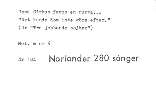 //// Uppå Cirkus fanns en nuppa,.. "Det kunde dom inte göra efter." (Ur "Tre jobbande pojkar") //// Mel. =nr 6 //// Nr 184 Noriander 280 sånger